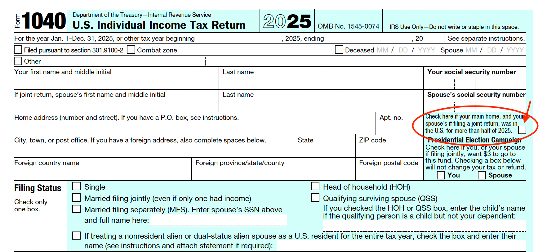 "Check here if your main home, and your spouse's if filing a joint return, was in the U.S. for more than half of 2025."